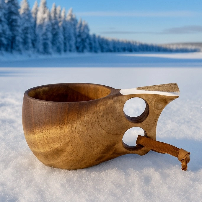 The Kaniini kuksa, in its dark version, is a tribute to the deep-rooted traditions of Lapland. Hand-carved from birch burl and treated with saltwater and coffee, it showcases rich brown tones and natural durability.