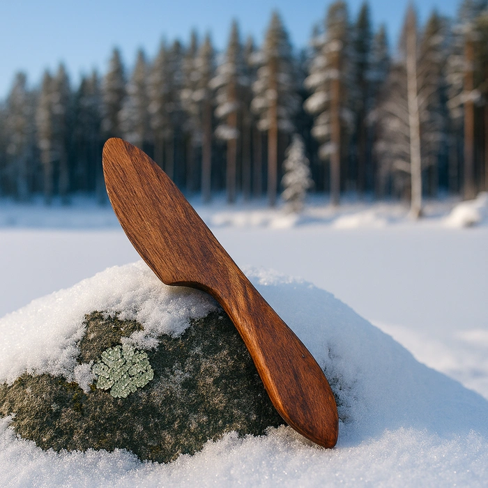 Kirjais is a rustic and elegant butter knife, hand-carved in Finnish Lapland from beautifully grained birch burl wood. Its ergonomic shape ensures a comfortable grip, perfect for spreading butter, jam, or soft cheeses.